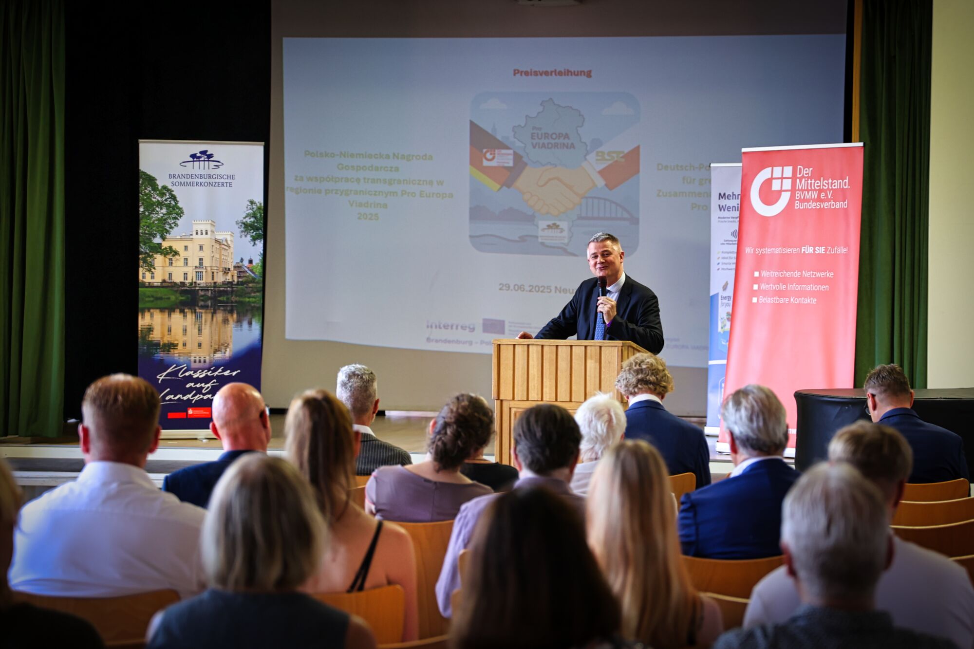 Neuzelle, 29. Juni 2025 – Unter dem Motto „Wirtschaft trifft Kultur“ wurde am Sonntag auf dem Campus des Stifts Neuzelle der Deutsch-Polnische Wirtschaftspreis 2025 verliehen. Die feierliche Auszeichnung würdigte herausragende unternehmerische Leistungen in der grenzüberschreitenden Zusammenarbeit innerhalb der Euroregion PRO EUROPA Viadrina.